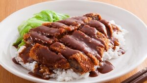 洋皿に盛られたライスの上に、揚げたてのビーフカツ、そしてデミグラスソース系のたれ。